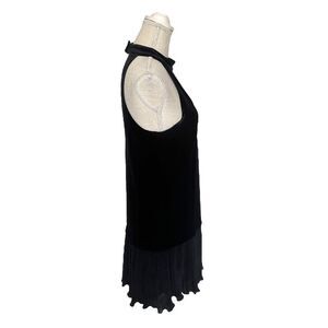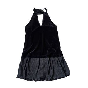 New with tags! black velvet Marianna mini dress with a halter/keyhole neck and button closure behind the neck. Ruffle detail at bottom hem. Drop skirt. Pleated. Button back closure. Measurements in pictures. Please feel free to ask questions!