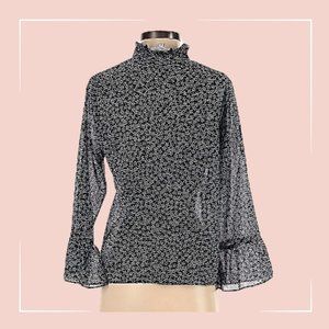 Gorgeous sheer lightweight blouse by Waverly Grey. Blue floral print, flutter sleeves, tie waste, buttons, ruffled collar. In excellent pre-loved condition.