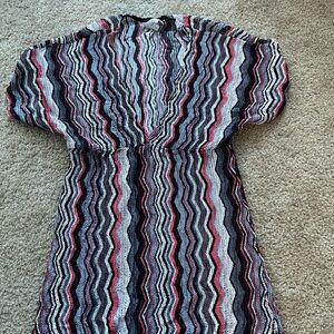 Stylish dress with a wavy pattern. Features black, white, and red colors.