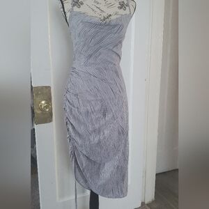 woven dress featuring an allover wavy striped print, cowl neckline, cami straps, ruched drawstring side, and cutout back below a self-tie closure.