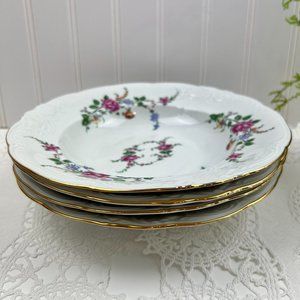 Wawel 4 Rimmed China Soup Bowls Poland Embossed Scalloped White Pink Roses