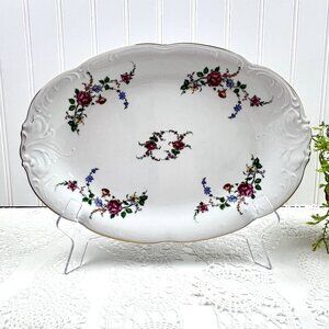 Wawel Poland Serving Platter Embossed Scalloped White Pink Roses 13" x 9"