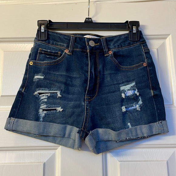 These are mid to high waisted short shorts. Dark wash jean shorts. They’ve only been worn once so they’re in great condition!