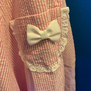 This strapless dress with a structured bodice features a pinstripe Barbie pink and white seersucker cotton fabric. The bust line and hem of the dress are trimmed in a dainty white lace. It has a sweetheart neckline, a flouncy perfect-for-spinning circle skirt, and a zipper closure going down the back. It has two adorable lace-lined pockets with precious grosgrain ribbon bows attached to them. It is a mini dress length. Would be fun to wear out to a Disney theme park day with cat eye sunglasses and some kitten heels for a fun retro look. Would also be a very sweet 1950s style vintage outfit for a party, swing dance, Dapper Day, or VLV.