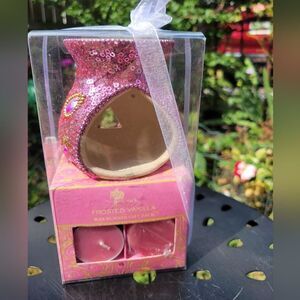 Super Cute Pink Sparkley Wax Burner Gift Set in Frosted Vanilla Flavor. Comes with 1 wax burner, 1 tea light candle, and 2 scented wax tarts.
