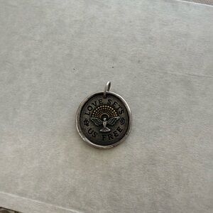 Elegant pendant with 'Love Sets Us Free' engraving. Features a silver finish with gold accents. Perfect for any occasion.