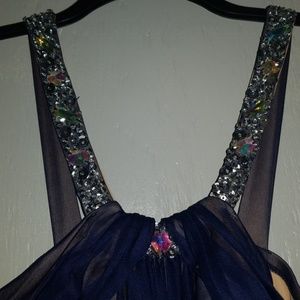 Tight fitting, stretchy material. Very comfortable. Worn once for maybe 2 hours! Top section is navy blue overlay with tan underneath, bottom is form fitting with slight ruffles.