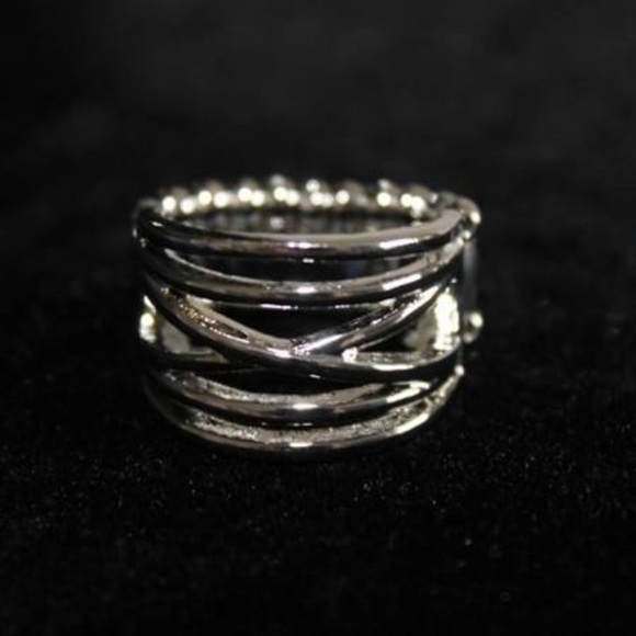 All silver ring with wider stretchy band to fit most fingers. Nickel and lead free.