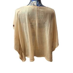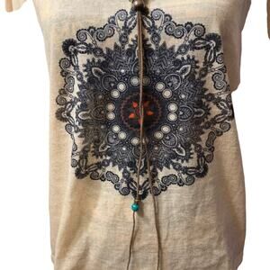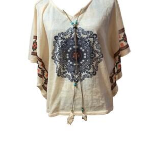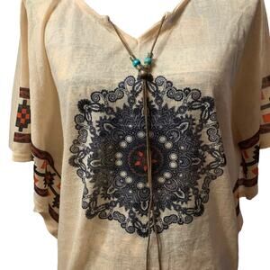 Lightweight soft fabric.. Turquoise and brown wooden beads on leather tie with feathers.