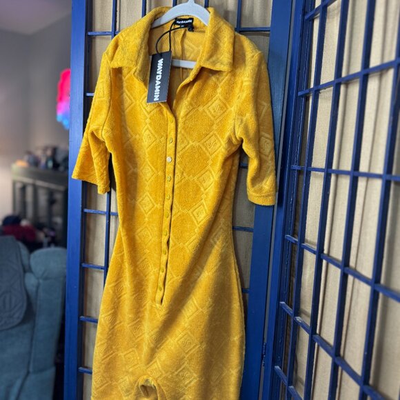 Waydamin Golden Yellow Terrycloth Button-Up Romper XS NWT