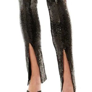 Stunning black sequin jumpsuit. Features a sleek design with front slits. Perfect for evening wear.