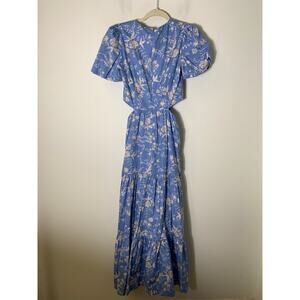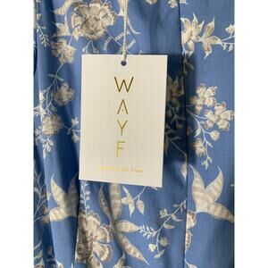 Charming mini dress by Wayf. Features a blue floral pattern. Short sleeves and a flowing skirt. Great for brunch, lunch, ladies outing.