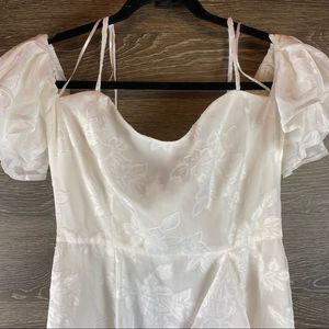 Cold-shoulder styling and a floral jacquard pattern add vintage romance to this flirty ruffled midi dress. Approx 40" center front length (size Medium)