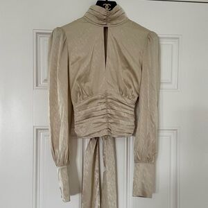 Elegant cream blouse with high neck. Features ruched waist and long sleeves. Perfect for chic occasions.