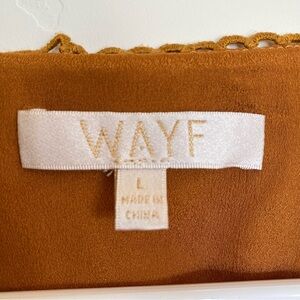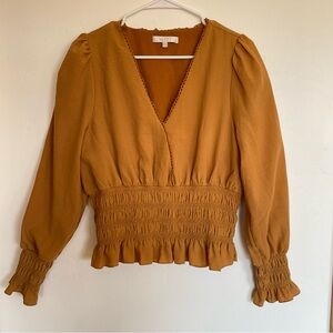 From Saks off 5th the Wayf Collection. This romantic golden top features a smocked waist and cuffs, cut with an elegant V-neckline.