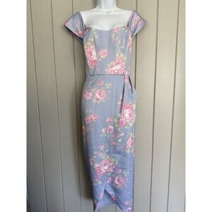 Wayf Dress L Large Sky Blue Satin Floral Gail Corset Bodice Tulip Hem Cocktail