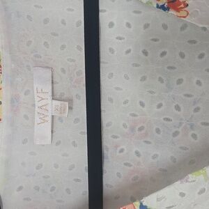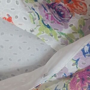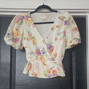 Wayf floral eyelet puff sleeve peplum top. Size XS. V-neck wrap style surplice top with a snap closure. The blouse is 100% cotton and the lining is polyester. This top doesn't have any stretch. So cute for spring and summer! Dry clean. Excellent pre-owned condition. No flaws or signs of wear!