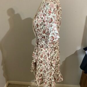 Elegant mini dress with floral print. Features ruffle sleeves and wrap design. Ideal for stylish outings.