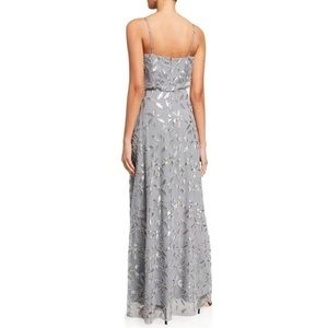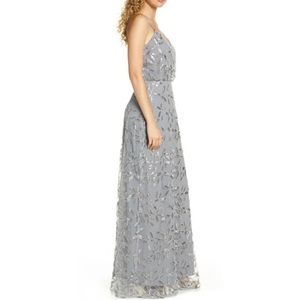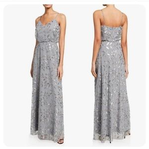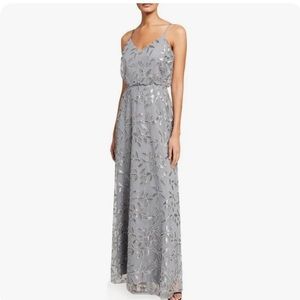 Elegant gray maxi dress with floral patterns. Features delicate straps and flowing silhouette. Perfect for special occasions.