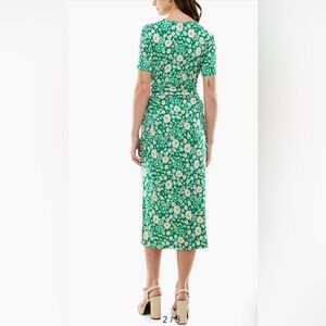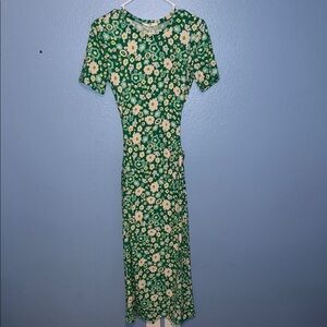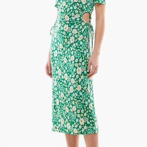 This Wayf dress features a vibrant green hue with a ruched design, offering a chic pencil silhouette perfect for resort wear. The midi length and lightweight fabric ensure a comfortable and stylish fit, making it an ideal choice for casual outings.