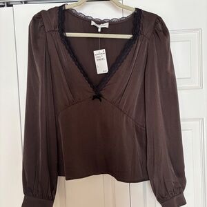 Wayf Longsleeve Brown Satin & Lace Blouse