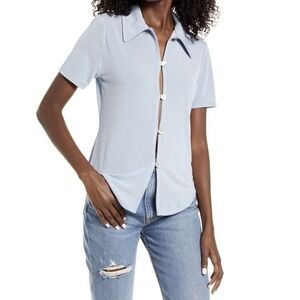 Wayf Naomi Short Sleeve Button Up Collared Top Shirt Blouse Small Blue *…