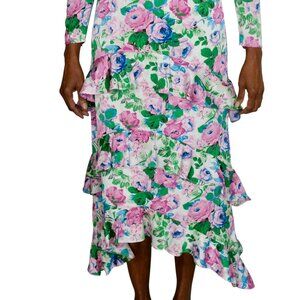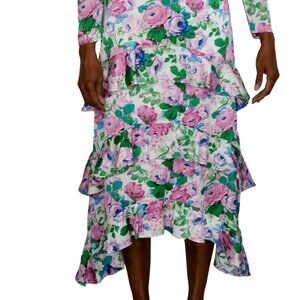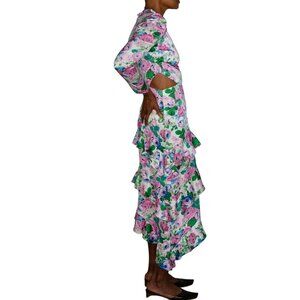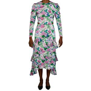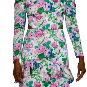 Wayf Pink Floral Print on White Satin Long Sleeve Dress with Side Cut Outs - NWT