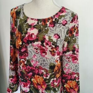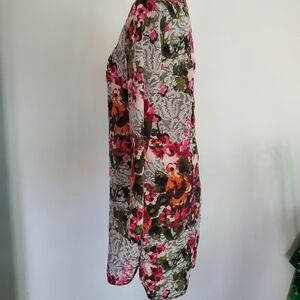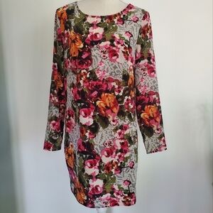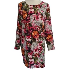 Wayf pixellated floral and paisley patterned abstract shift dress with long sleeves and zipper back.
