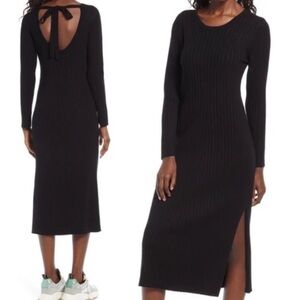 WAYF x Dede & Emily Ribbed Sweater Midi Dress with Tie back detail. Fitted bodycon style with stretch. Brand new with tags. Blogger influencer favorite. Total length from shoulder to hem approximately 50”.