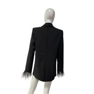 Wayf 'Romee' Black Polyester Blazer Size S: lightweight, low-stretch suiting, long sleeves with fixed ostrich feather trimmed cuffs, lightly padded shoulders, notched lapels and single-breasted button placket, welt hip pockets, lined.