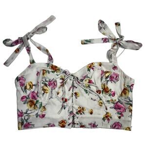 Beautiful Seanna crop top from WAYF. White with pink and yellow flora design. Cropped with a sweetheart neckline and corset style lace up front. Back is smocked and stretches for a perfect fit. Sleeveless with tie shoulder straps that can be adjusted as desired. Hidden side zipper. Perfect for spring and summer. Pairs great with a midi skirt or high waisted pants.