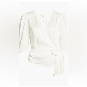 Wayf Ulla ivory wrap blouse. Good used condition. Not perfect - there are a couple of small stains, see pictures. I honestly think they are not noticeable when worn. Gorgeous, flattering blouse with puff shoulders, surplicing.