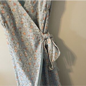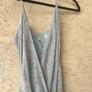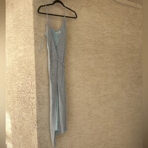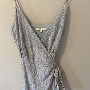 The wrapped silhouette of this side-tie dress designed in allover ditsy blooms with slinky spaghetti straps. • True wrap style with side tie closure