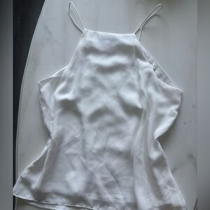 This elegant white camisole from Wayf design with a stylish front. The top is adorned with intricate white-on-white embroidery, adding a touch of sophistication to its flowing silhouette. Perfect for a romantic, bohemian look, this camisole is a versatile addition to any wardrobe.