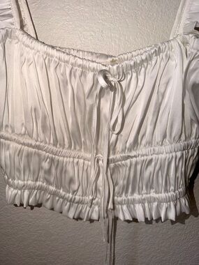 Lightweight satin white crop top with feminine ruffle trim. Adjustable drawstring at the center front. Elasticized waist panels for a snug fit. Ruffled straps add delicate detail.