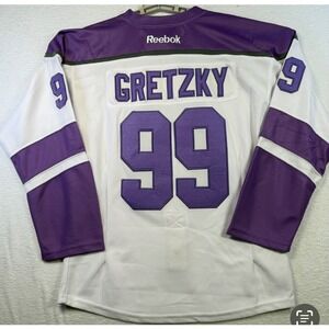 Show your support for the fight against cancer and honor a hockey legend with this Reebok Edmonton Oilers "Hockey Fights Cancer" Wayne Gretzky #99 Jersey. This special edition jersey features striking purple and white color blocking, embroidered Oilers front logo, and player number #99 with "C" captain patch. Made in Canada by CCM, size 54.