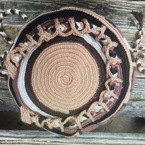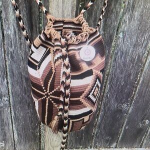 Stylish Wayuu backpack with drawstring closure. Features a geometric pattern in earthy tones. Made in Colombia