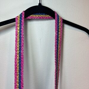Wayuu Bucket Bag Pink Blue Yellow Green Long Adjustable Crossbody Strap Unlined Drawstring Closure with Wooden Bead Accents Colorful Handmade Unique Vibrant Durable Boho