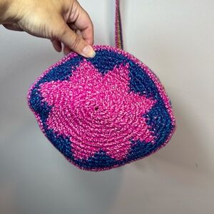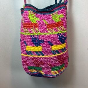 Wayuu Woven Bucket Bag Purse Pink Yellow Wood Bead Animal Print Cinch Close Boho
