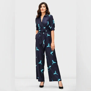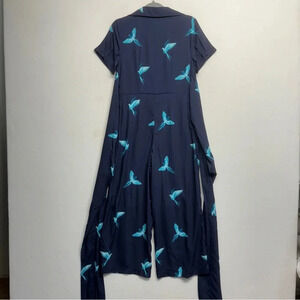 Wayward Fancies EShakti Wide Leg Bird Jumpsuit Navy Blue M Belted Pockets