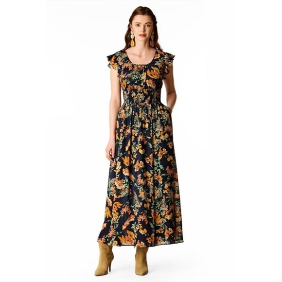 Wayward Fancies Eshakti Women's Navy Blue Floral Boho Midi Flutter Dress Large
