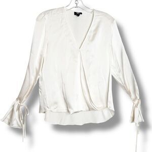 W by Worth 100% Silk Cream Faux Wrap V-Neck Blouse Bell Tie Sleeves Women’s Size 4