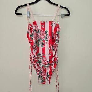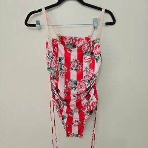 We Are HaH One Piece Swimsuit Red Floral Blood Orange Stripe Ruched Women Size M