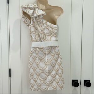 EYELET LACE DESIGN, RUFFLED ONE-SHOULDER STYLE, AND BELTED WAIST
