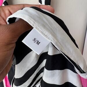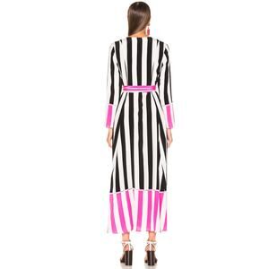 We Are Leone maxi cardigan dress. Features bold black and white stripes with pink accents, belted waist, long sleeves, and flared hem 100% silk. Excellent pre-owned condition, some minor marks throughout, no major callouts. Size S/M.