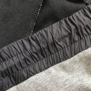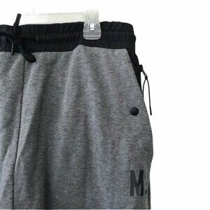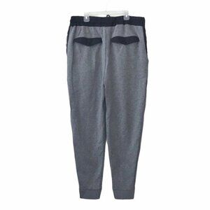 Gray joggers with black accent pockets, waistband, and tie drawstring. Have double front pockets with snap button closures and zip closures.