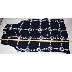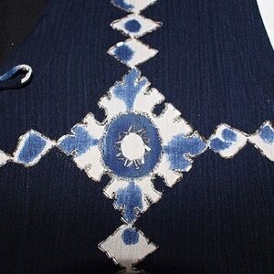 The pattern of this vest is a stamped tribal light blue against the dark blue background, with silver tone beading throughout. Also partially lined in black.