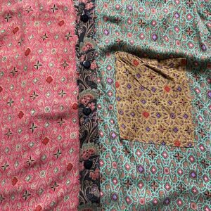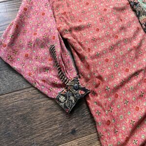 Pre-owned We Be Bop women’s button-down blouse featuring a bold mixed print patchwork design in pink, red, green, and mustard tones. Made from soft 100% rayon with a striped collar, contrast cuffs, and a single chest pocket. Relaxed fit silhouette with buttoned cuffs and curved hem.