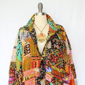 Awesome vintage 90’s We Be Bop jacket. Awesome ethnic, Aztec, southwestern Bohemian Woodstock vibe. Made from multiple light weight cottons in Aztec, floral and medallion patterns. Awesome patchwork pattern. Super cool bomber, varsity design. Quilted black lining creates a puffer effect. Super cool Dolman sleeves. Mock collar detail. Banded waist line and cuffs. Front zipper and additional button closure. Similar in design to jams world, aviator nation, farm, Rio, free people, Sundance and Anthropologie designs. Wear this awesome piece with your favorite true religion bell bottom jeans, aviator nation shirt, and Danner boots.