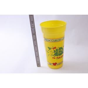 We Squeeze To Please yellow lemonade cup is perfect for summer parties! Plastic drinkware doubles as souvenir, ideal for refreshing gatherings.